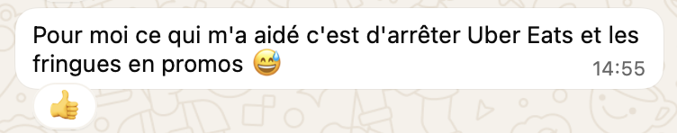 En 2 mois je suis passé de 8 Uber Eats par mois à 1 seul. J’ai acheté aucun nouveau vêtement “plaisir”, j’ai attendu qu’un jeu vidéo baisse avant de l’acheter, j’ai désinstallé Amazon et Temu de mon téléphone. J’ai limité mes sorties restaurants et soirées à 100€/nuit.